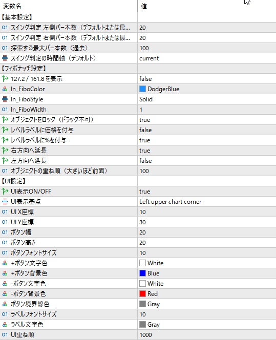- フィボナッチラインやUI(ボタン類と表示テキストのセット)の色・位置等はインプット項目から設定できます。