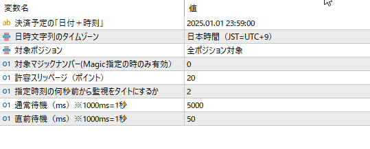 決済対象のポジション。保有ポジション全て、またはマジックナンバー指定から選択。