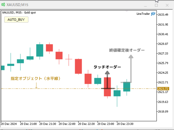 指定ライン到達後のオーダー戦略を、タッチオーダーと終値上値/下値確定後オーダーの2種類から選べます。
