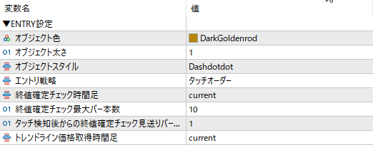 終値確定後オーダー指定時は、ラインタッチ検知後に終値確定するタイミングで毎回チェックを入れ、以下の条件を満たした時にオーダーします。