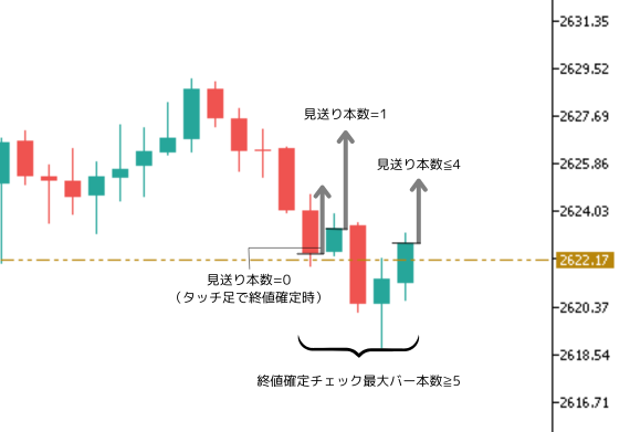 - タッチ検知直後からの終値確定チェックを見送るバー本数(デフォルト:1本)