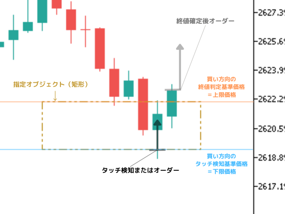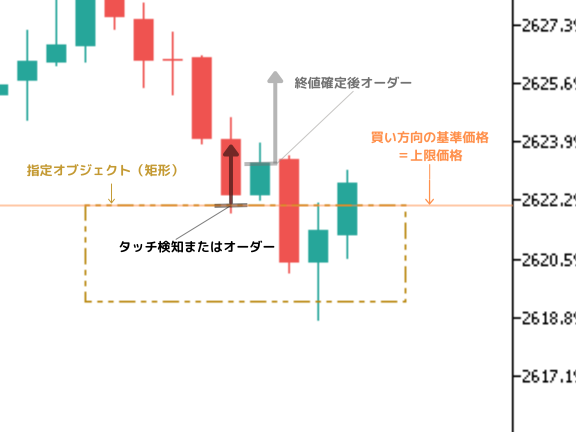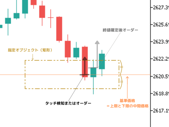 矩形の一方の端のみをタッチ検知と終値判定に活用するモードです。買い方向の場合は上限価格、売り方向の場合は下限価格が基準になります。デフォルト設定はこのエッジ価格基準になっています。