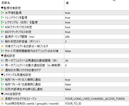 水平線(HLINE)を監視対象に含めるかどうかを設定します。サポート・レジスタンスラインなどの水平線に価格が触れた時に通知を受けたい場合にtrueにします。デフォルトはtrue。