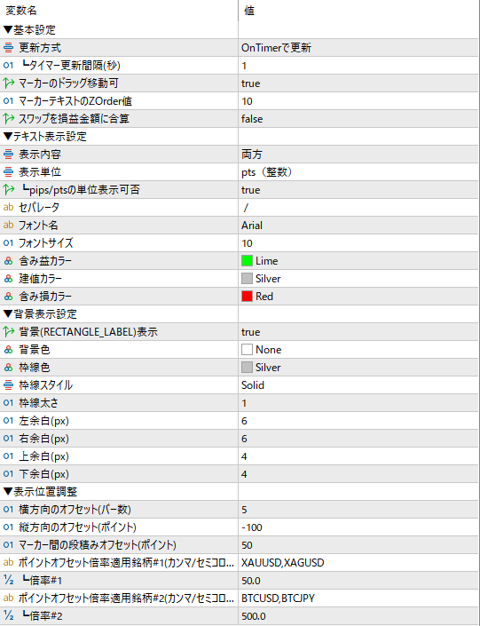 更新トリガー方式の選択。以下の2方式があります。迷った場合は、まずはOnTimer方式が扱いやすいです。 - OnTimerで更新(タイマー方式):指定秒数ごとに更新します。相場が止まっていてティックが来ない時間帯でも一定間隔で損益表示が更新されやすく、安定して動きます。一方で、更新間隔を短くしすぎるとPC負荷が増えることがあります。OnCalculateで更新(計算方式):チャートの計算タイミング(主に新規ティックやチャート更新)に合わせて更新します。ティックが多い時間帯は追従が細かくなりやすい一方、ティックが来ない状況では更新が止まりやすく、損益表示や背景追従が「次の更新まで動かない」ことがあります。