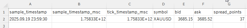 | ティックベース | – 新しいティックが届くたびにそのまま記録 – 各ティックの bid/ask/spread をそのまま残す – データ量は多くなるが、市場の細かな動きを忠実に再現できる | – 1秒間に届いたティックをまとめて最小値・最大値・平均値・件数を出力 – 秒ごとのサマリーになるのでファイルサイズを抑えつつ変動幅は把握可能 |