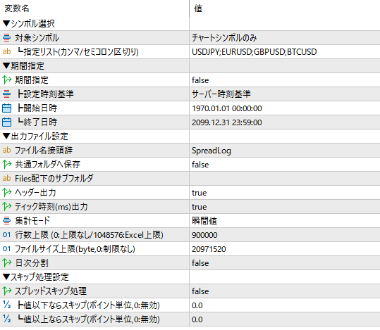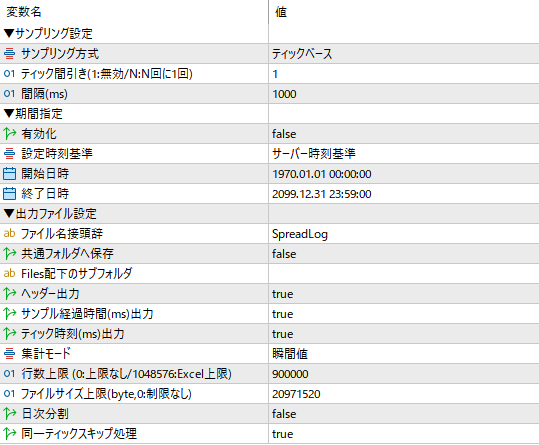 出力されるCSVファイルの先頭名を指定します。シンボル名やタイムスタンプと組み合わさり「SpreadLog_銘柄名_サンプリング方式_集計モード_実行開始タイムスタンプ_通番.csv」表記の一意なファイル名が生成されます。例:「SpreadLog_USDJPY_TICK_INSTANT_20250921-123000_001.csv」