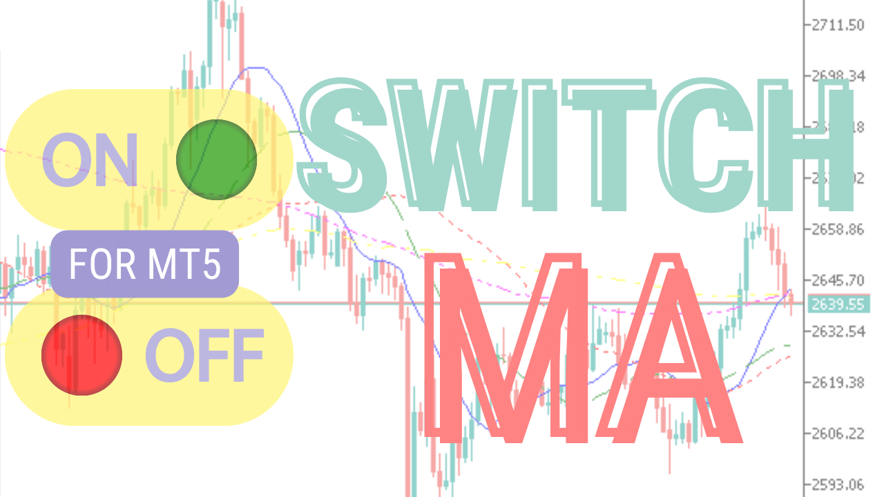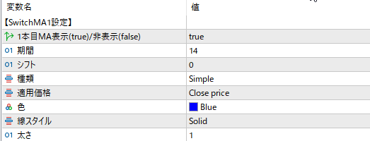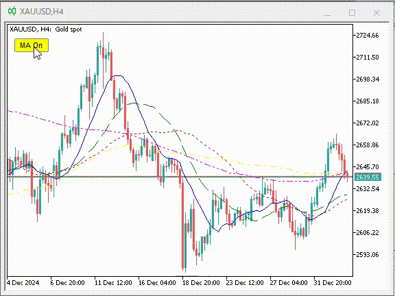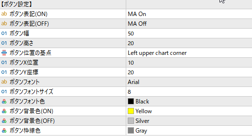 一括表示/非表示の切替ボタンが付いているだけの、ごくシンプルなMAインジケーターです。移動平均線を一時的にまとめて消したい、逆に一時だけ見たい場合などに使えます。